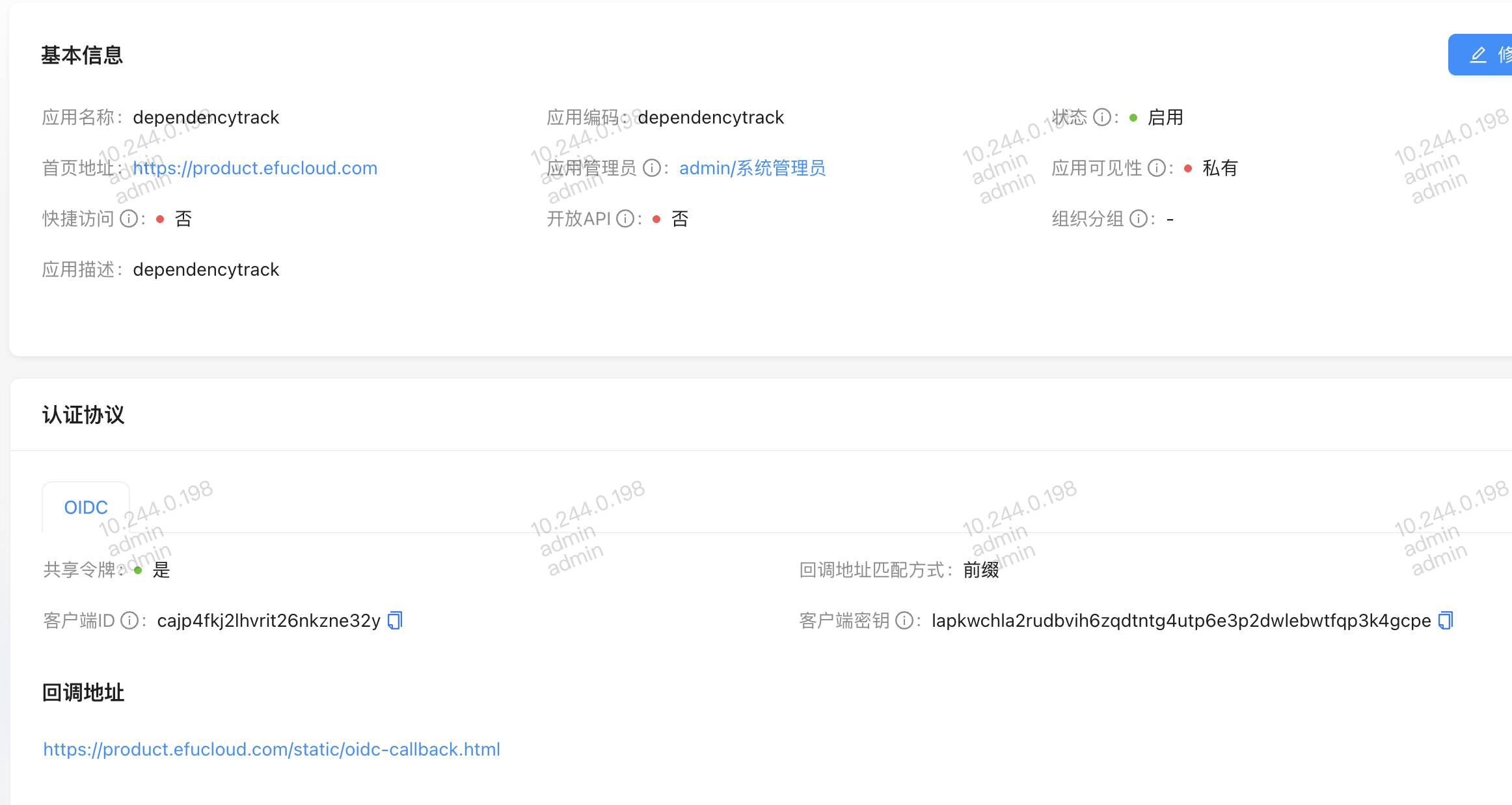 dependencytrack,需要确保回调地址为https://product.efucloud.com/static/oidc-callback.html,eauth支持多种回调地址匹配方式,特别是针对云IDE场景下,能简化运维,减少不必要的应用数量。